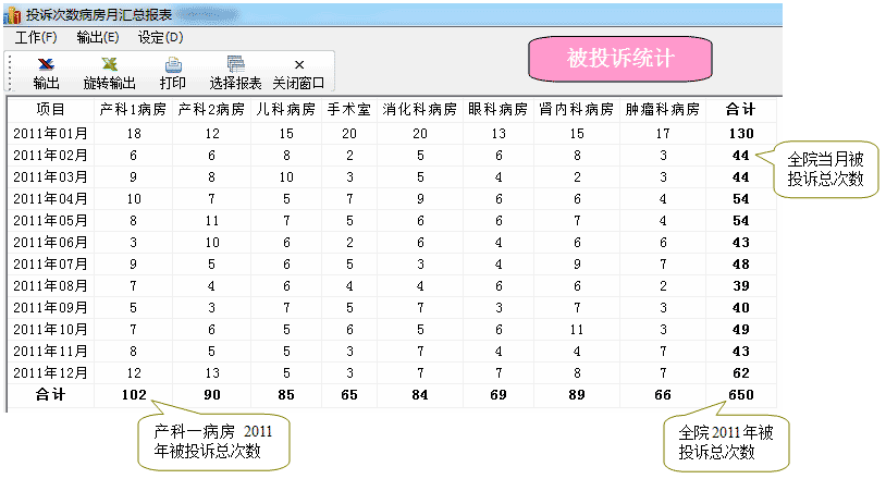 2、对比统计1年内各病房被投诉次数